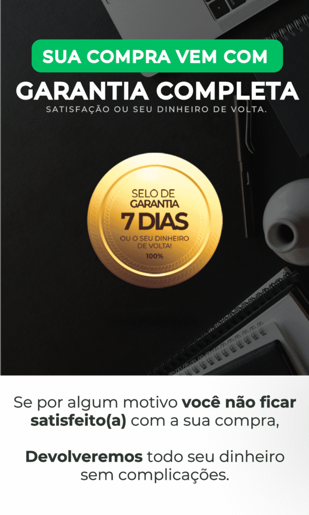 Se não se identificar com o material por qualquer motivo, devolvemos 100% do seu dinheiro — sem perguntas, sem burocracia.